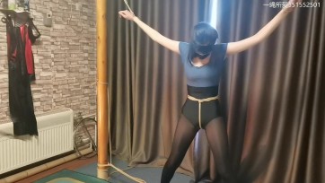 【逍遥】高挑模特被丝袜套头绳索层层缠绕绑在柱子上+紧密驷马捆绑,高跟鞋绑脸羞辱