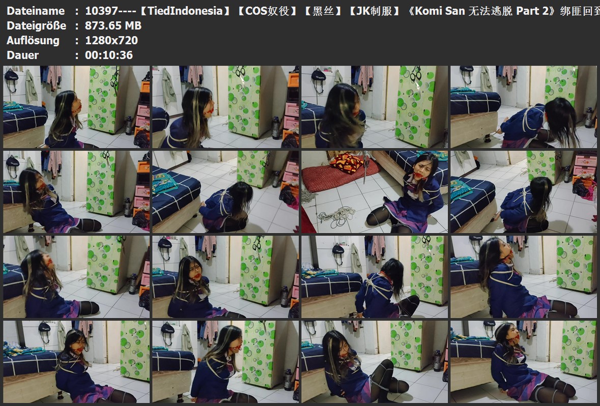 【TiedIndonesia】【COS奴役】【黑丝】【JK制服】《Komi San 无法逃脱 Part 2》绑匪回到Komi San,邀请她玩游戏。 komi san 被绑成青蛙式,双手被绑在床上。 komi san前面挂着剪刀