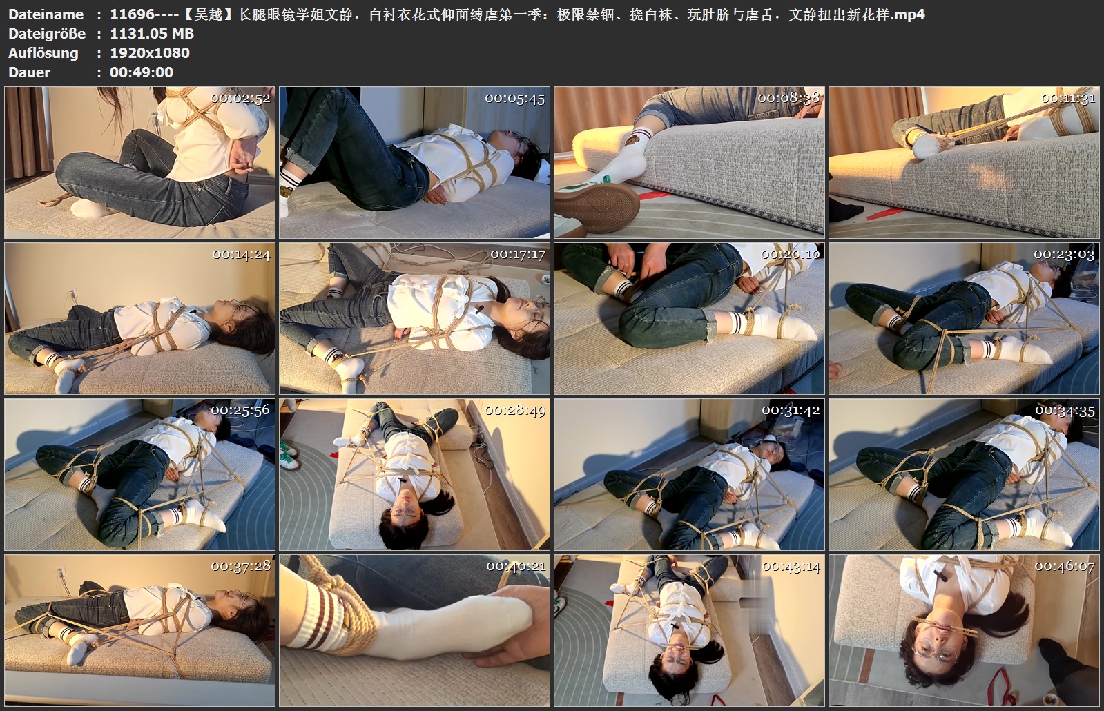 【吴越】长腿眼镜学姐文静,白衬衣花式仰面缚虐第一季:极限禁锢、挠白袜、玩肚脐与虐舌,文静扭出新花样