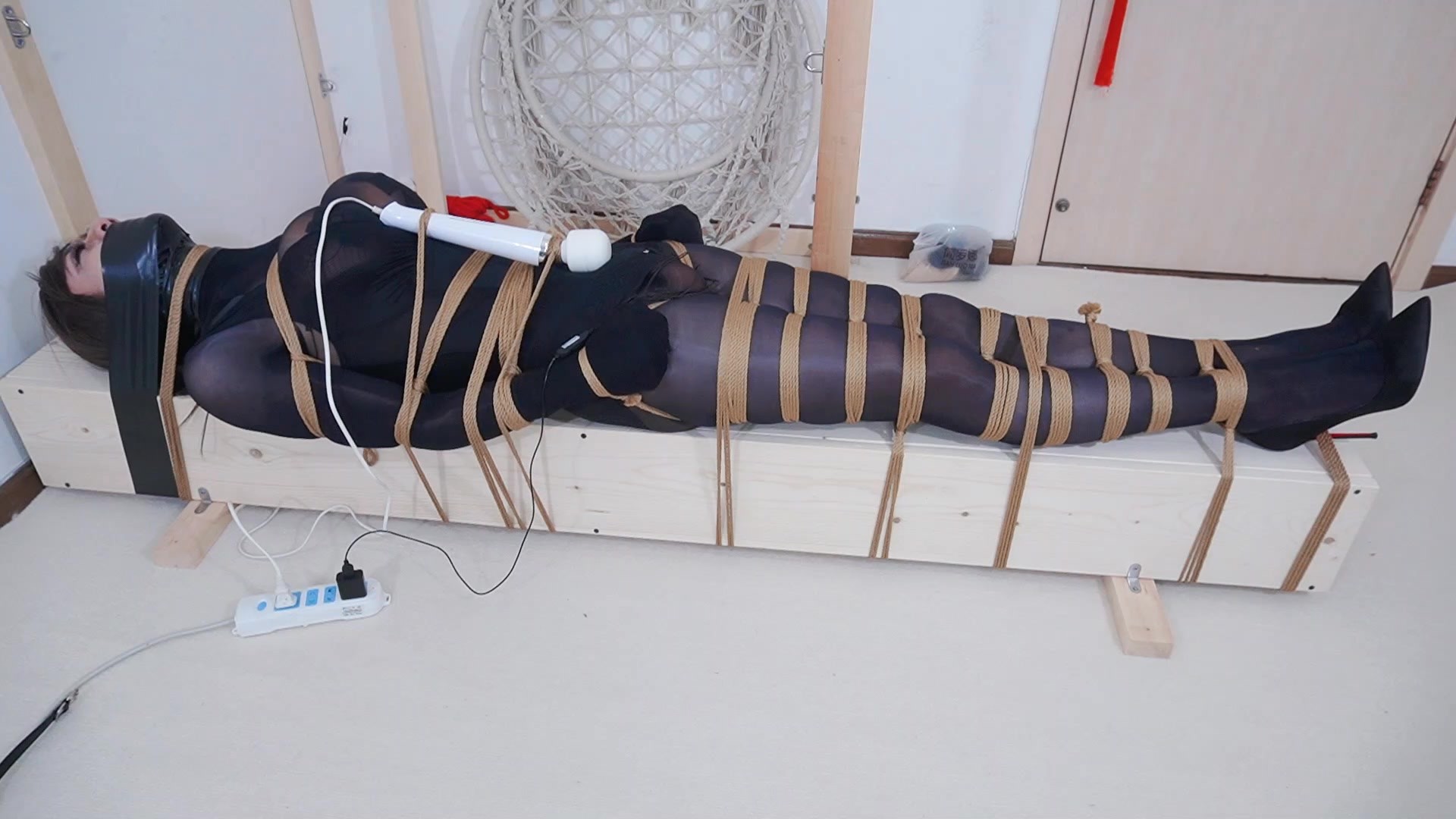 伪娘绳M潇潇身着黑衣躺着被密密麻麻的绳子捆在条凳上,嘴巴用胶带和条凳固定死,手上套三层短丝袜,套上专门的震动训练器,外部再固定,时间长达一个小时,手部虽然能够到快乐棒,但是由于套着丝袜,解不开绳子,只能忍受着