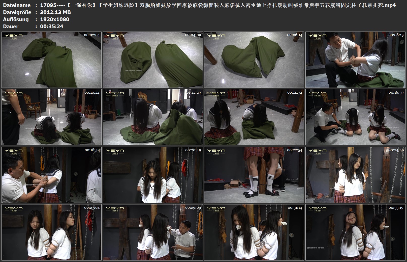 【学生姐妹遇险】漂亮天真活泼双胞胎姐妹俩家门口被麻袋绑匪装入麻袋抗入密室地上挣扎滚动叫喊轧带后手五花紧缚固定柱子轧带扎死