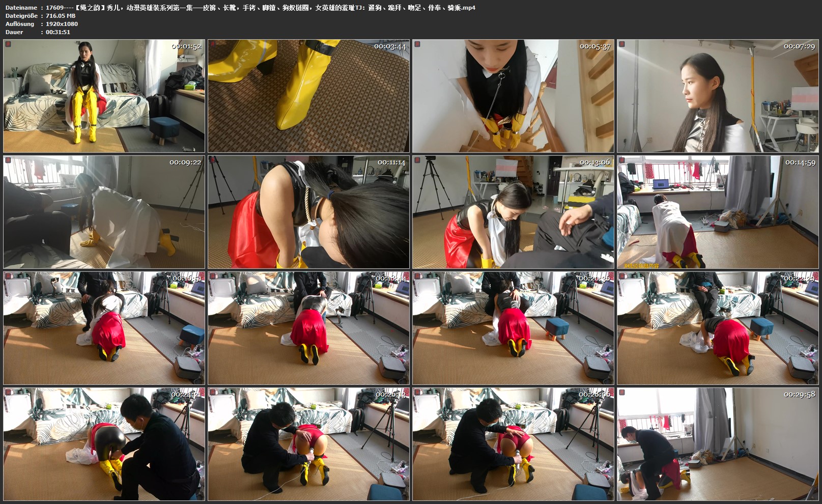 【绳之韵】秀儿,动漫英雄装系列第一集——皮裤、长靴,手铐、脚镣、狗奴链圈,女英雄的羞耻TJ:遛狗、跪拜、吻足、侍奉、骑乘