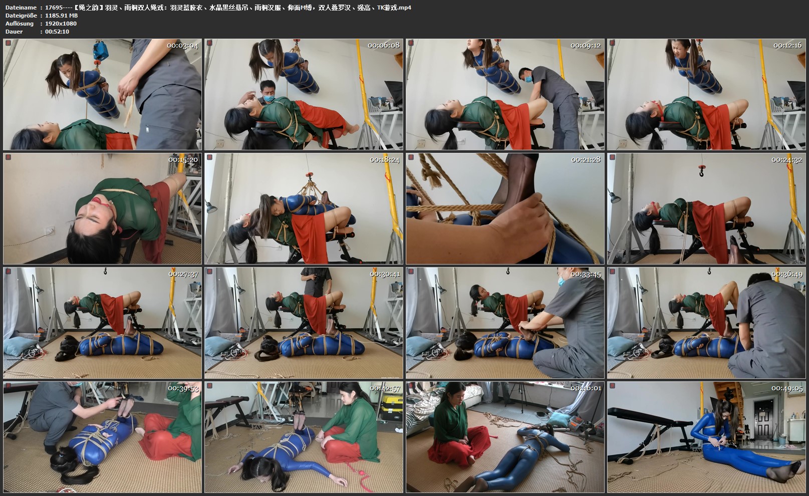 羽灵、雨桐双人绳戏:羽灵蓝胶衣、水晶黑丝悬吊、雨桐汉服、仰面M缚,双人叠罗汉、强高、TK游戏