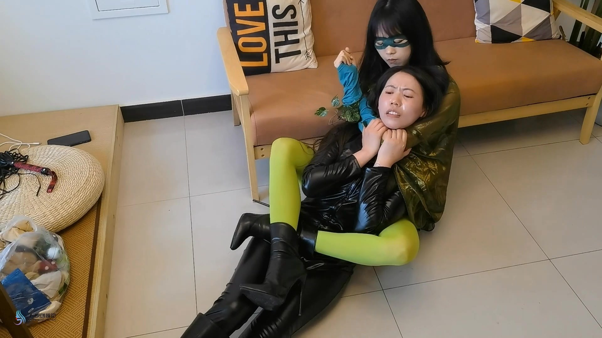 毒腾女找到暗夜女侠,两人一言不合亏就开始打了起来。毒腾女趁机从后面抱住暗夜女侠,双腿紧紧的扣住对反过的身体,同时臂对桉叶女侠进行锁喉。女侠不断挣扎,但很快便缺氧晕了过去。女侠再次醒来时候,发现自己手脚被镣铐束缚着。她想挣脱,但铁链很牢固。过了一会毒腾女走了过来,用她穿着靴子的脚踩住女侠的脖子,毒腾女此时只有一只脚着地,女侠看准时机,抓住她的脚用力一抬,女腾女失去重心摔在地上晕了过去。当她再次醒来时候,她发现自己被铁链镣铐束缚成驷马的姿势趴在床上,嘴巴里还塞着口球。此时女侠走进房间,用皮鞭抽打着毒腾女的身体。打累的女侠脱掉自己的靴子来到床上,她捧起毒腾女的脚丫,抚摸并亲吻着。突然女侠用力掰着对方的脚,毒腾女痛苦的挣扎着。但很快她的脖子被女侠用片子勒着,慢慢的睡了过去