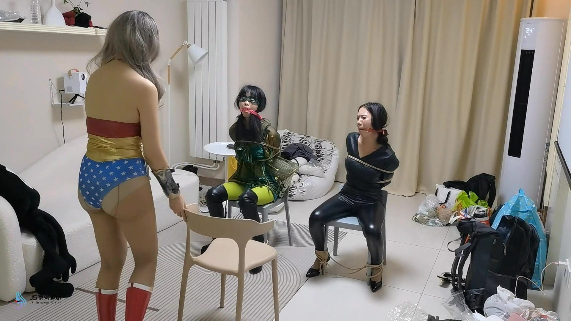 神奇女侠用被两人折磨的不断呻吟。就在对方不注意的时候,女侠拿起掉落的药瓶喷向两人,女侠解开绳子,看着面前睡去的两人,露出了邪恶的笑容。