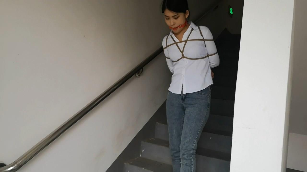 【随心原创】冷兮 白衬衣 牛仔裤 楼顶木头上的捆绑 手脚捆绑艰难的下楼梯