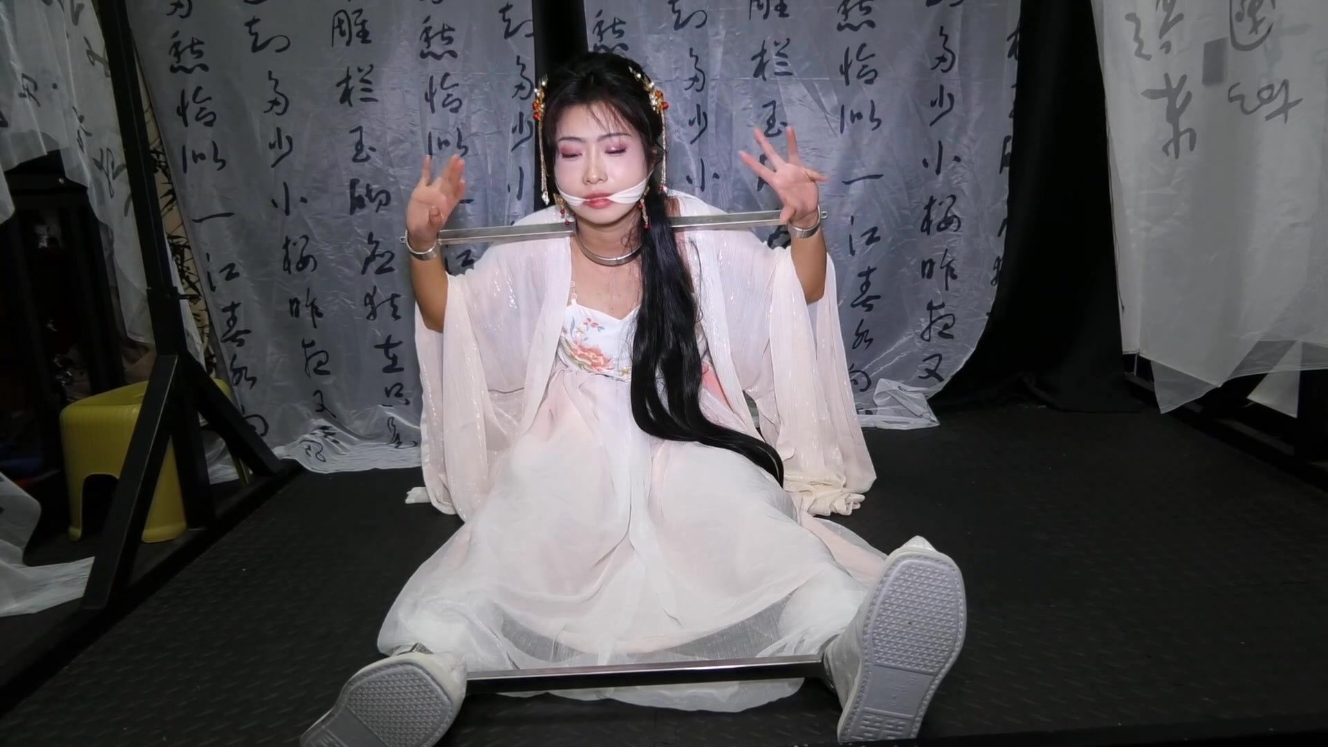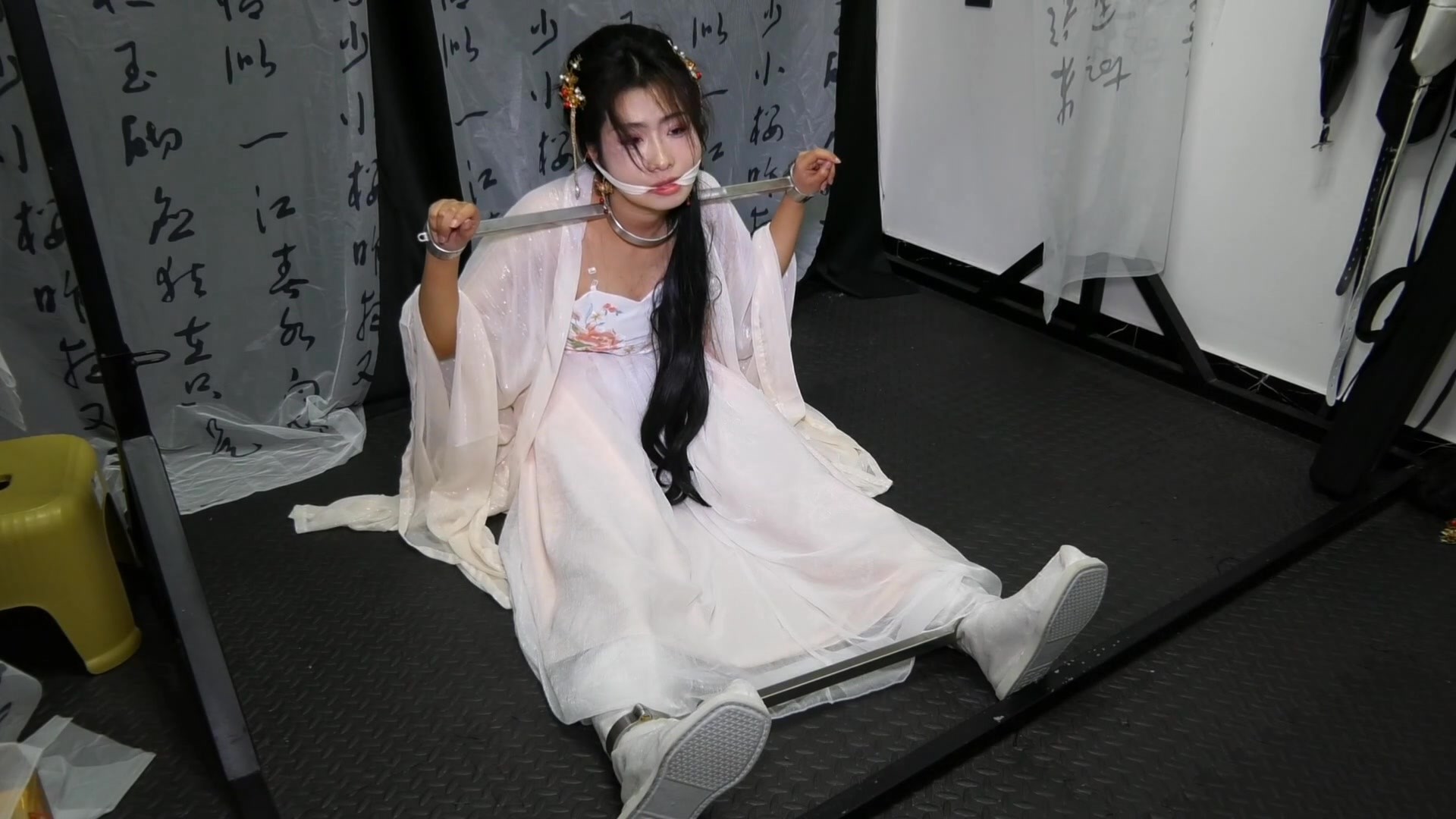 四角固定架和一字金属枷拘束着穿着古装打扮的美女