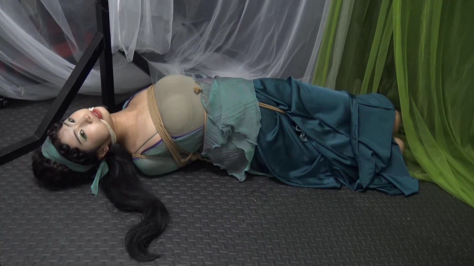 被女绳师抓捕到的青蛇,吊缚在空中,胳膊极限后拉,嘴巴勒上丝巾,呈后躺姿势在半空中挣扎,接着欧式极限后绑仍在地上放置挣扎