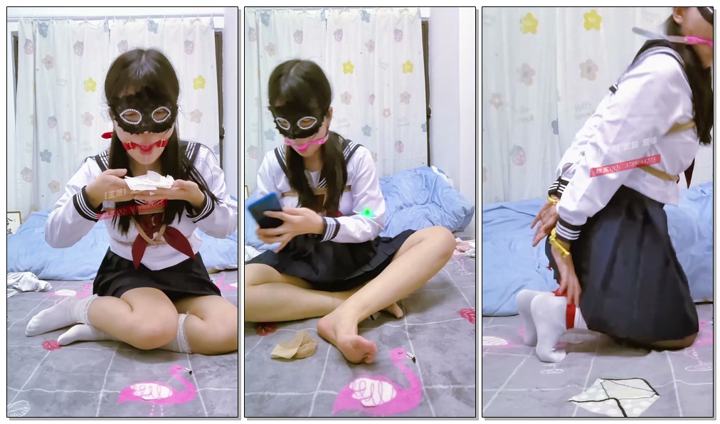 水手服,半腿袜,戴上口球,绑一个日式,双手反绑,秀腿秀脚丫;把袜子慢慢褪下,脱至脚踝处,秀脚,再把袜子脱下来,秀小袜子;换一双袜子,戴上脚镣,反过去趴在床上看书或者玩手机,翘腿,秀脚丫;换一双肉色短丝袜,秀脚丫后,换一个口球,换黑丝+白色短袜;把脚绑起来,绳子另一头先从绑上身的绳子背后穿绕过来,再向下使点劲拉,让腿尽量弯曲靠近身体,然后把绳子从身后穿过两腿中间,从裆部过来拉到身子前面,拉紧绑到绑胸部的绳子上;♡ 把双手反铐起来,试试跪起来,然后试试把腿伸开,换几个姿势活动,秀腿秀脚丫,再趴在床上秀脚丫,最后解开