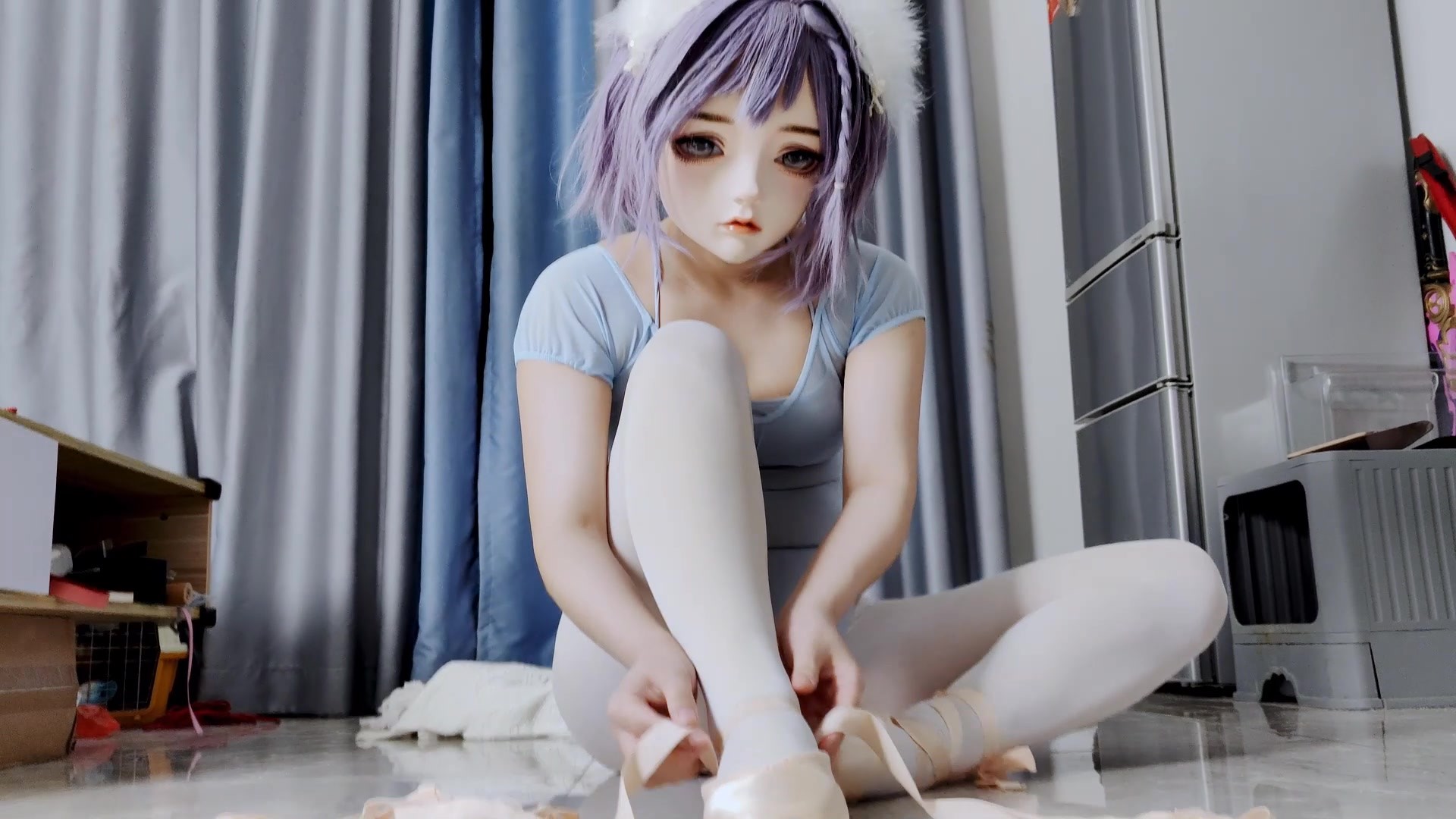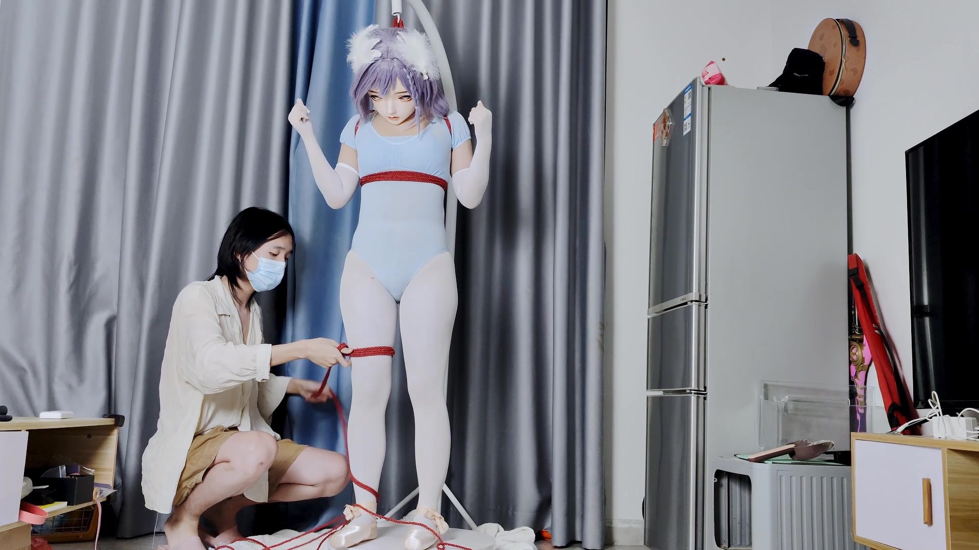 练习芭蕾的人偶少女含着棒棒玩具极限吊缚
