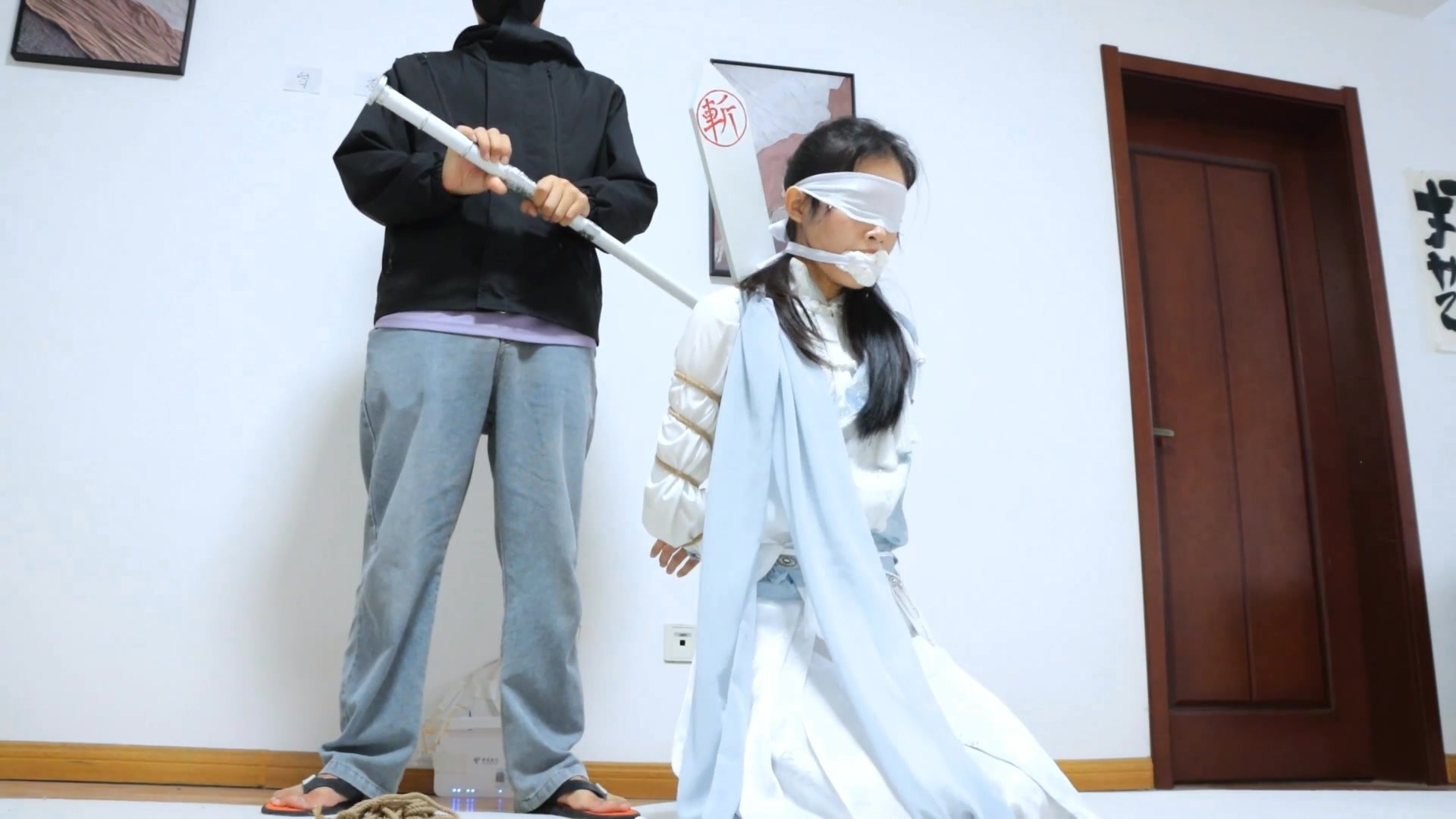 将她绑好后将她双手吊高,用白布蒙上双眼,摘了她的面纱,再背后插上亡命牌,果然,女侠的口中还塞着白布袜呢,怪不得有口难言。