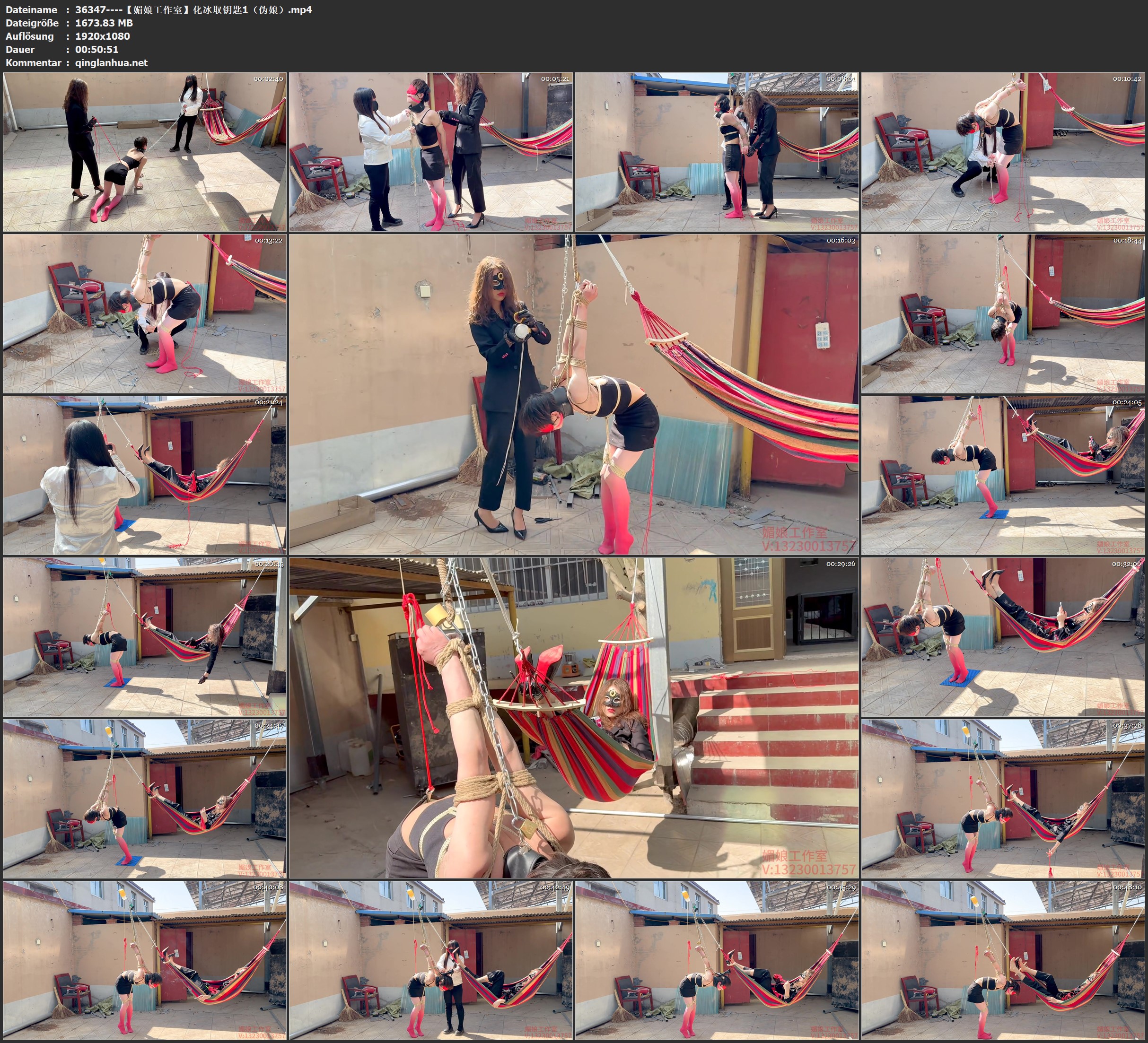 贱狗带着肛G在笼子里待了一夜,恰好遇到好天气,媚娘跟水儿决定带他晒晒太阳,顺便玩个小游戏。等贱狗爬出来后媚娘给她戴好项圈就牵着往外面走,水儿在后面扯绑在肛G上的绳子,贱狗痛苦的爬下楼梯来到了院子里。媚娘让贱狗站起来给他绑上直臂缚,把膝盖也绑了起来,接着用一道绳子将他的脖子连了起来,这样贱狗就不能把腰直起来了。媚娘把吊钩放了下来和贱狗手腕上的绳子绑在一起,等吊钩升上去贱狗就只能垫着脚来支撑身体的重量。接着水儿从房间里出来手里拿着被冻住的钥匙绑在了机器上边,原来媚娘把贱狗手上的绳子用锁固定在吊钩上面,这下贱狗只有等冰块化掉才能被解开。媚娘没有玩尽兴就把贱狗肛G上的绳子也吊了起来,这样贱狗撑不住把屁股放下来就会扯到肛G。接着又拿来了指压板放在贱狗的脚下,现在贱狗就只能痛苦的哭喊了。水儿躺在旁边的吊床上时不时踩他几脚,就在这个安静的午后贱狗就只能乖乖的等待冰块融化了