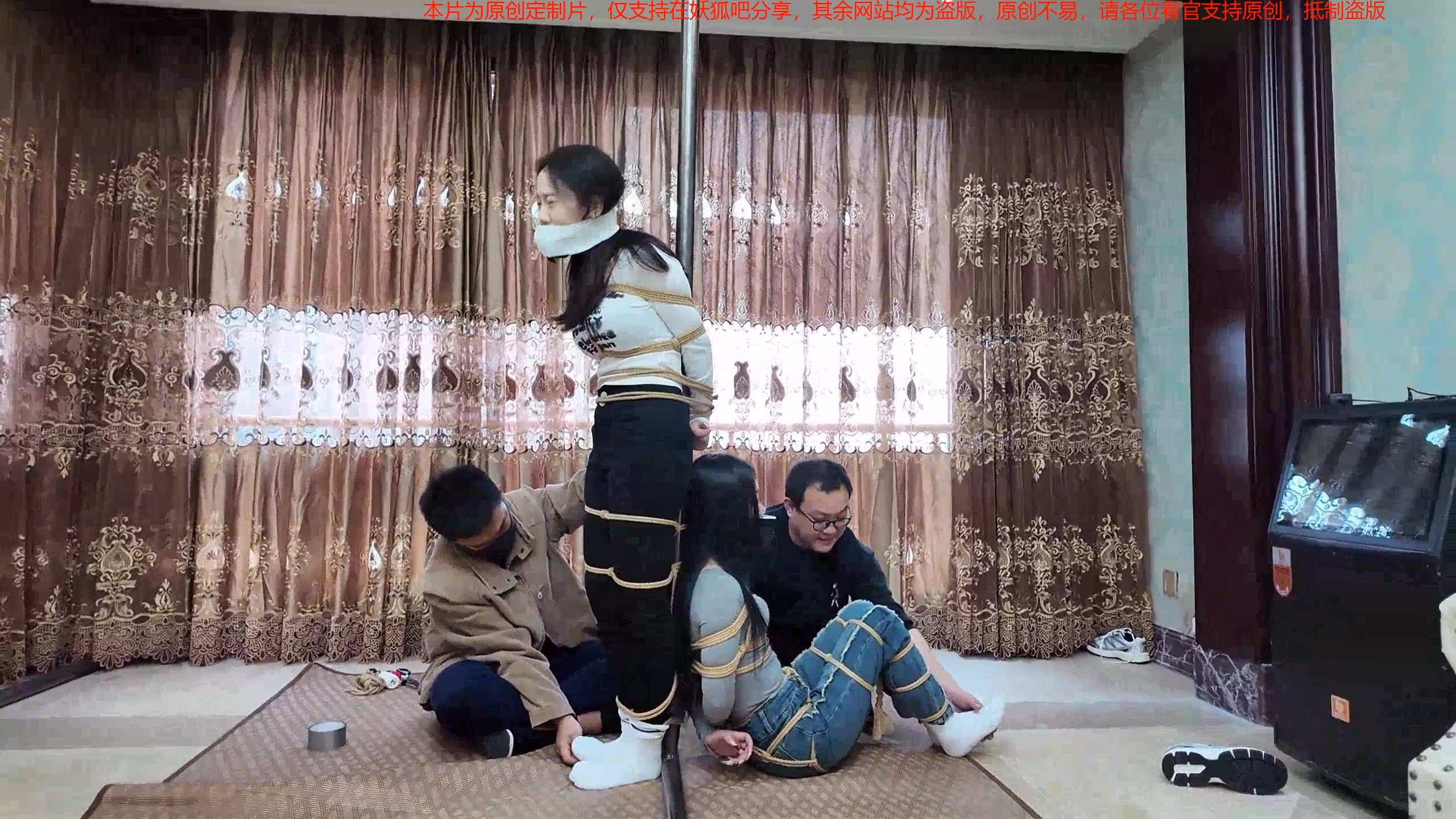绑匪一脚刹车,连坐在位置上的坏人都朝前一下,头撞到了驾驶座位,痛苦不已,当然更痛苦的是塞在后备箱的两美女,呜呜表示抗议,可两绑匪哪管美女的抗议,哪懂什么怜香惜玉呀!下车,打开后备箱,抗两美女一气呵成,简直不要太熟练。镜头一转,两绑匪扛着两美女走进了他们的老巢,将两美女扔到沙发上,然后两绑匪将两美女搂在怀里,开始讨论如何玩弄她俩,芷溪和大雷呜呜呜又屈辱又不情愿又无可奈何,被五花大绑的自己只能接受命运的安排,成为绑匪的玩物!两绑匪一番商量决定把大雷站着捆绑在柱子上,把芷溪坐着捆绑在柱子上,这样有两个好处,就是方便两绑匪玩弄两美女,而两美女除啦能扭动身子其他动弹不得。商量决定后,二绑匪先将大雷捆绑到柱子上,捆绑好她上身后,二绑匪脱去大雷的靴子,露出了白袜,然后再将她的双脚捆绑到柱子上;将大雷捆绑结实后,绑匪又将芷溪压到柱子边,让芷溪坐下后也将她结结实实地捆绑在柱子上。将两美女捆绑结束后,绑匪拿来一块厚毛巾,解开芷溪的口球后,将厚毛巾塞入她的樱桃小嘴里,也是难为芷溪了,樱桃小嘴里塞着块厚毛巾别提多难受了,可绑匪丝毫没有停下,继续在芷溪嘴上贴了五张黑胶布,彻底让她说不了话了,只能发出呜呜呜的闷哼;将芷溪捆紧堵严后,二绑匪将手伸向了大雷!对于大雷的嘴巴,当然是绷带伺候,一圈又一圈缠绕的白色绷带把大雷嘴里的棉袜深深地堵在嘴里,让大雷就算在难受也只能发出几声呜呜呜的闷哼。将二美女捆紧堵严后,两绑匪兴奋到了极致,立马合力脱了芷溪的鞋子,对着她的白袜脚,腰子疯狂TK,芷溪呜呜呜得难受挣扎,绑匪问芷溪:舒服不舒服?芷溪摇摇头呜呜呜不舒服,绑匪说到:那就继续挠,挠到舒服!芷溪又受着TK,接着绑匪又问到:舒服不舒服这回?芷溪呜呜呜道:舒服了!绑匪说到:舒服呀?舒服就再让你舒服一下!这绑匪是真的损,挠着芷溪后又问她,这回你舒服了,是不是让你姐姐也挠一挠舒服一下?芷溪呜呜呜摇头拒绝,绑匪说到:那既然你姐妹情深,就继续挠你。芷溪呜呜呜带着哭腔再次接受新一轮的挠脚心,挠腰子呜呜呜!接着,绑匪又问到:这回你爽了吧?该挠你姐姐了吧?芷溪呜呜呜含糊不清道:挠姐姐吧,我受不了了。绑匪说到:是你连累你姐姐,现在还让我们挠你姐姐,我们要教教你怎么做人!接着加大挠的力度,芷溪呜呜呜被TK得筋疲力尽只得低着头,生无可恋的发出呜呜呜的声音,玩腻了芷溪的二绑匪,又将坏念头指向大雷,又开始对大雷动手动脚还说:事情都因为你妹妹而起,要怪就怪你妹妹吧,和我们没关系。然后对着大雷的腰子,脚心疯狂TK,大雷呜呜呜挣扎,可胸部,肩膀,双手,大腿,膝盖,脚腕都被结结实实绑在柱子上的她,除了发出呜呜呜的声音外做不出任何回应。接着二绑匪觉得二人玩一女腻了,就分工,一人挠一女,好让芷溪和大雷都享受到被TK的快乐!最后玩腻的二人,决定去吃点东西,检查完二美女身上的绳索捆绑得是否紧缚和嘴里的堵塞物是否严实后,对美女进行警告,让二美女老实点后离开,留下被结实捆绑堵嘴的二女在柱子上挣扎并发出呜呜呜的声音