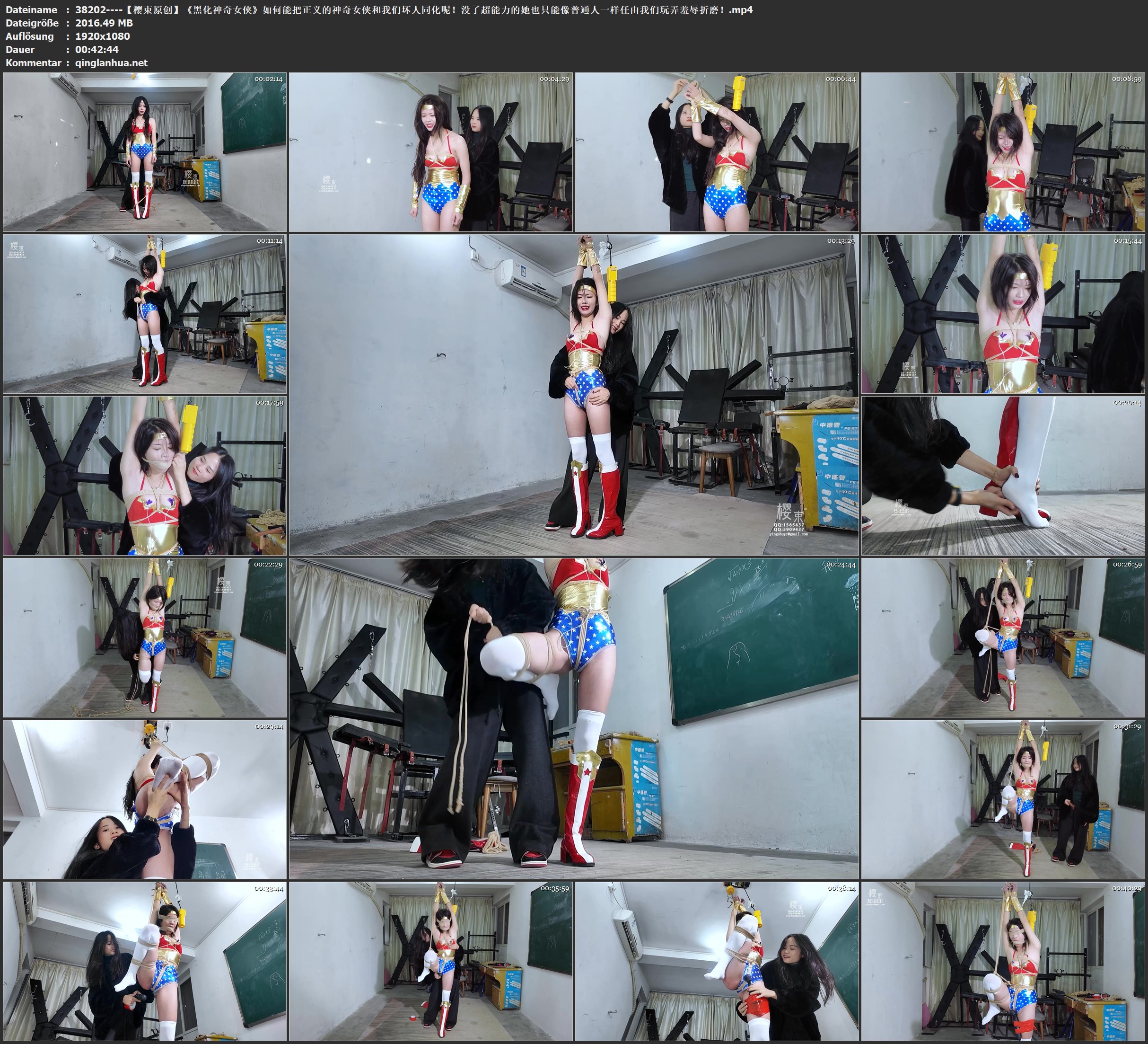 如何能把正义的神奇女侠和我们坏人同化呢!没了超能力的她也只能像普通人一样任由我们玩弄羞辱折磨!将她单脚吊起狠狠的鞭打挠痒折磨!丝袜堵嘴勒嘴蒙眼!棒棒R夹同震羞耻强G呻吟!