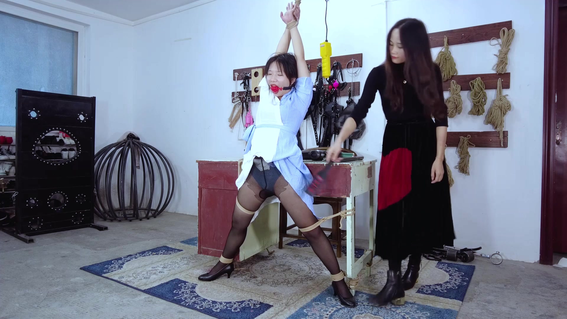刚毕业的甜甜在网上投了份简历今天来应聘M,来到办公室看到墙上挂的绳子和女绳师拿来的各种道具心里有些忐忑不安!但又非常想获得这份工作便答应绳师先给她绑上尝试一番看她是否适合这份工作!办公桌上前手吊缚大字开腿,带上口球各种TK,看她的口球适应能力和怕痒程度!再用棒棒和炮机看她的敏感程度在强烈的震动下敏感的她很快便G潮了!鞭打和电击看她的疼痛承受反应!总之一系列的尝试下来绳师还算满意的!可想而知甜甜还是表现的挺好挺适合M这份工作的