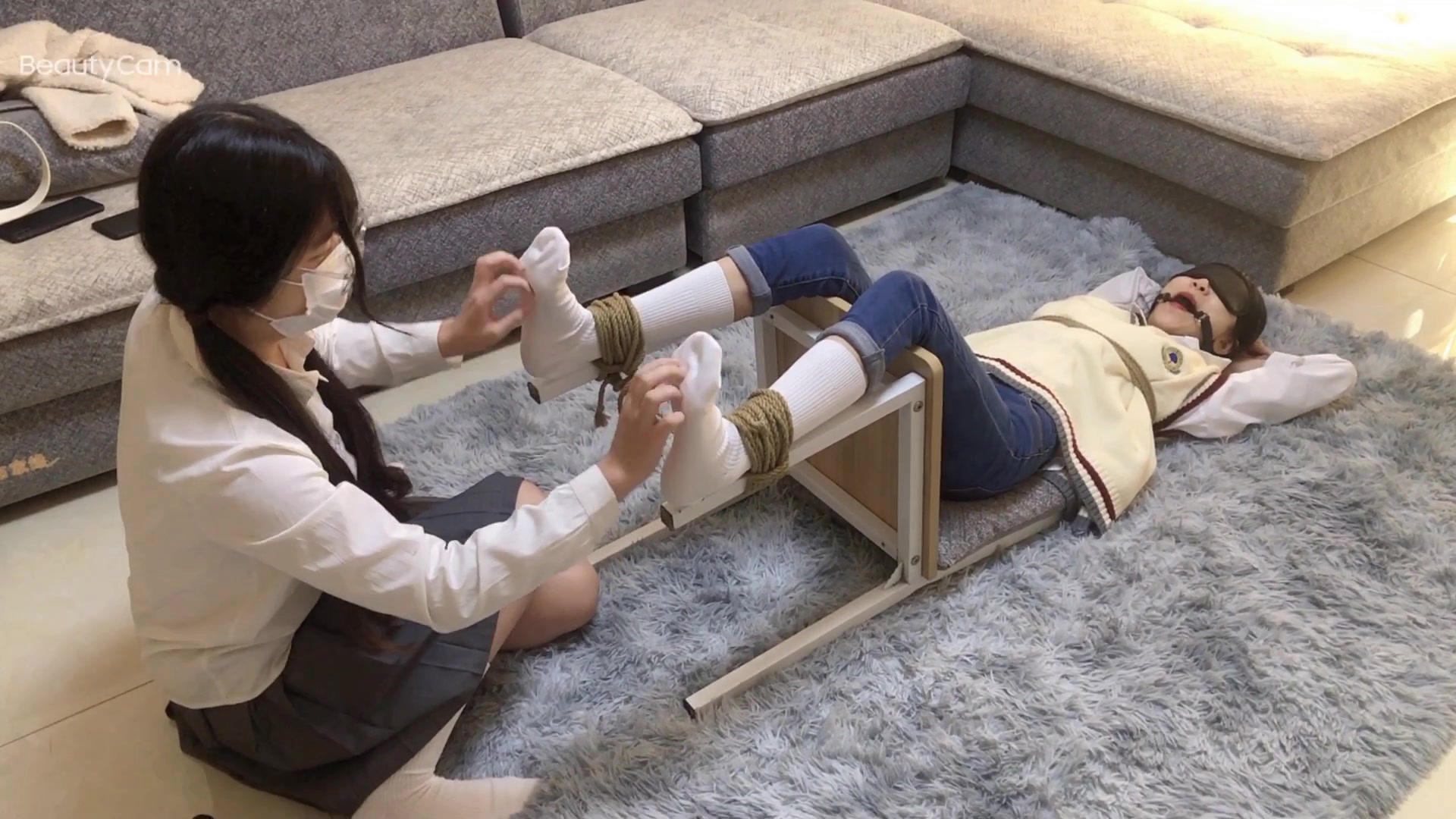 豆子累了一天回来,小玉关心的给自己的好姐妹递过来一瓶放了药的水,豆子喝了一口,还没说几句话就晕过去了,等她醒来,已经被小玉绑在椅子上,放到在地了。双手抱头交叉绑在后脑,蒙眼嘟嘴,小玉一边笑着,一边脱掉了豆子的鞋子。露出那白色的棉袜。