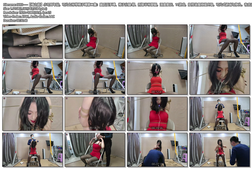 【绳之韵】小可拜年贴,可儿红吊带椅子缚第二集:脑后反手缚、椅子分腿绑、刑架半吊禁锢,深度亵玩、TT游戏,奴性培育持续升级,可儿式娇喘与挣扎,有点凌乱的丽人。