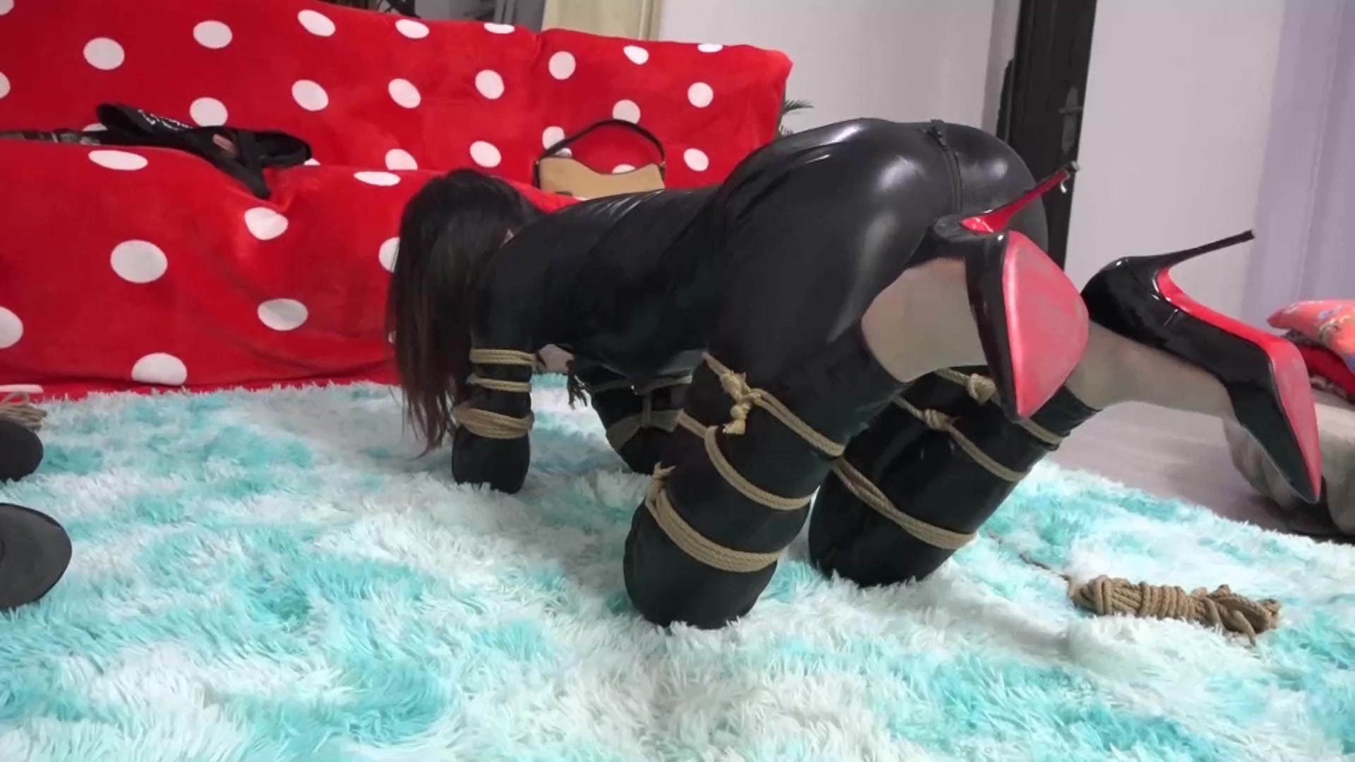 两条小臂绑在背后,腿随意绑住即可。脖子和大腿绑在一起,脸贴在腿上。