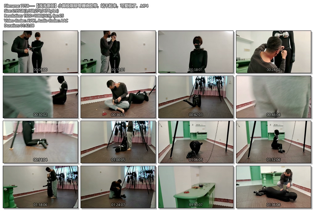 拘束要点和行动的影响:一小手握拢,紧密的缠绕胶带:双手变得圆圆的无法拿剪刀,钥匙,更没办法打开全包连体衣后面的拉链,身体永远的被封固在连体衣里面。二把m34码小脚极限掰弯缠绕胶带:脚掌脚背变成弯弯的茄子,没有支撑点,站不起来,好气好气。三多重严密堵嘴,丝袜+内裤+3种胶带缠绕:特别紧,发不出声音,只有微弱的闷骚呜呜呜声。