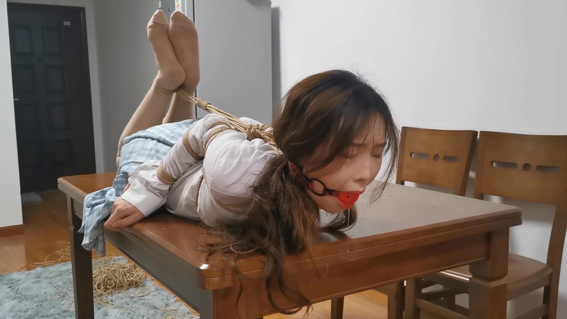 这次依旧是舞蹈生美女雨琪,穿上JK制服很有学生气质,对于她这次依旧是严厉的直臂驷马紧缚超长时间放置。前几次定拍都让她把口球吐出来了,这次特别用绳子穿过口球皮带向后拉紧,雨琪尝试了一个半小时都没吐出来,口水滴滴答答流了一地。这次绑的很紧,她几次想翻身都很困难,最后手脚都给捆麻了。