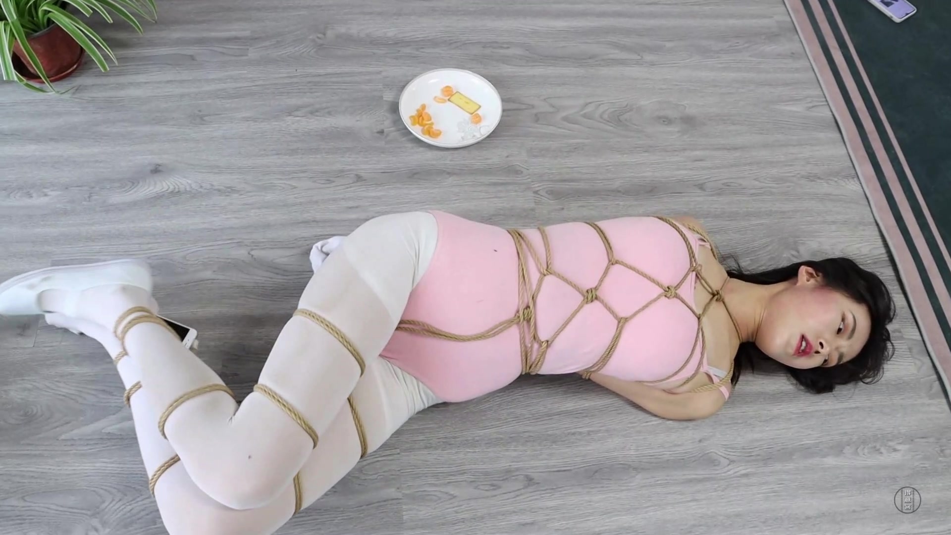 虽然上次尝试逃跑以失败告终,但是南羽还是不死心,这次又被换了一身衣服,趁着吃饭的机会还是想尝试逃跑,偶然在地上发现一部手机,又燃起了一点希望,努力挪到手机旁边,几番尝试发现手机根本没电,只能准备挪到窗户边向外呼救,希望有人能注意到她,然而事与愿违,坏人正好回来了。坏人为了惩罚南羽,把她绑成欧式驷马后用一根绳子固定在横梁上,用南羽自己的棉袜堵住嘴再透明宽胶带缠住,南羽的嘴都变形了。这种姿势下南羽挣扎了很久然并卵,最后只能绝望的放弃了挣扎。。。